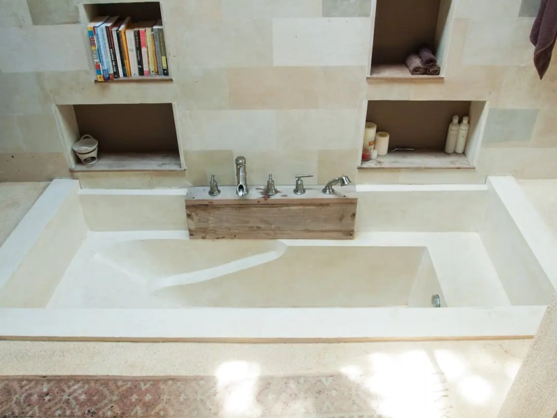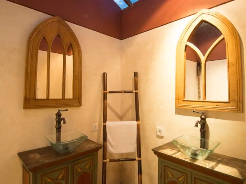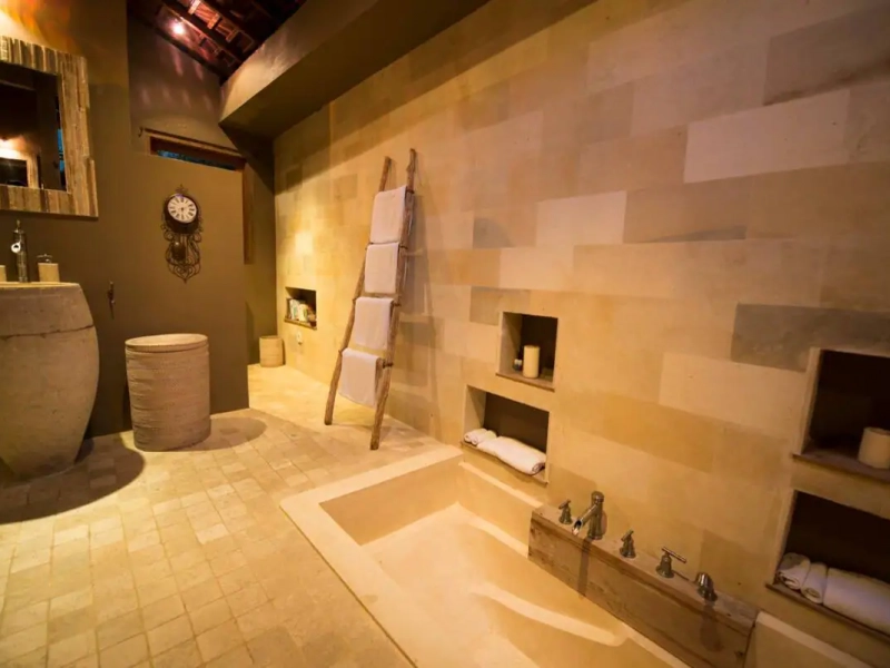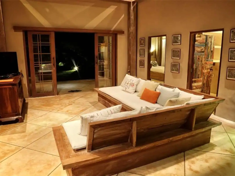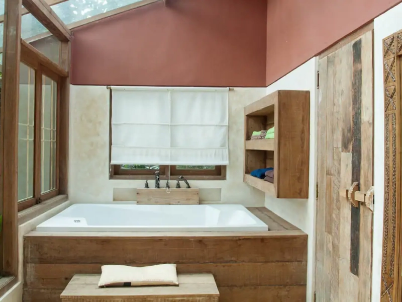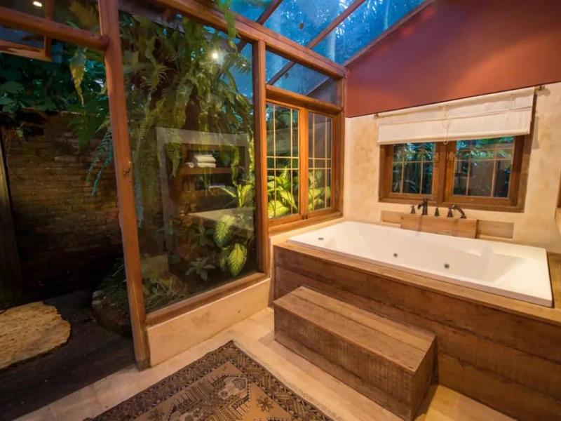 The two bedrooms are spacious with two single beds in one, and a custom-made double bed with a pull-out single underneath. They share a bathroom made entirely from glass (including the roof!) with huge trees overhead, an outdoor shower, and a giant two-person jacuzzi tub.