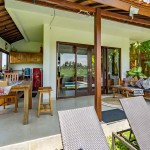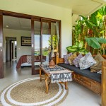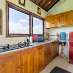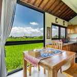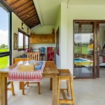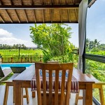 Attached to the verandah dining space is an open fully-equipped kitchen with a large fridge, stovetop, toaster oven, and all the utensils you’ll need for cooking. The lush rice fields are the backdrops for the kitchen, terrace, and pool areas.